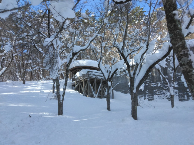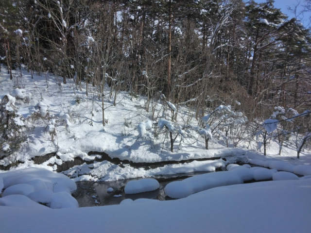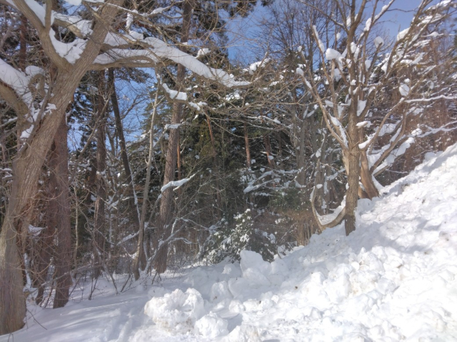 でもコースから外れると雪も深いものでした。雪と冬木立の中では時々日射しが遮られるとモノクロの世界のような錯覚を感じました。
