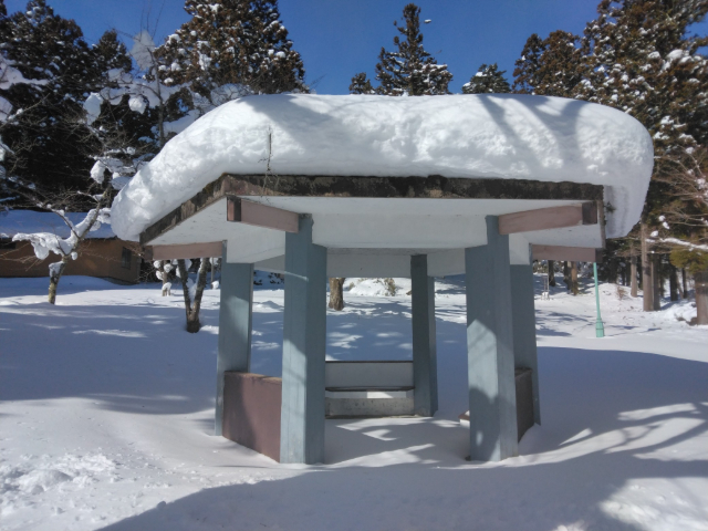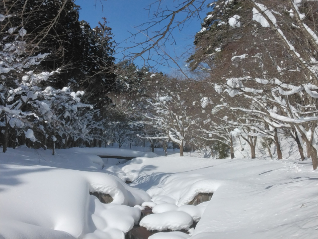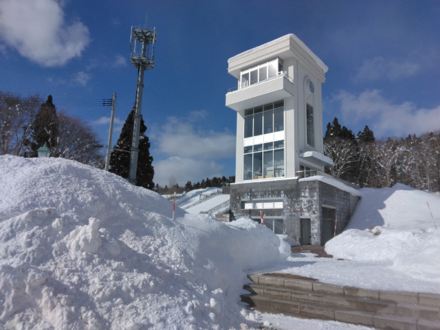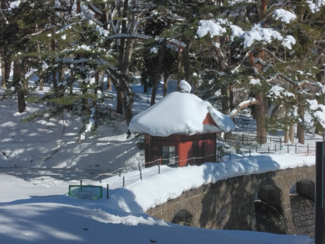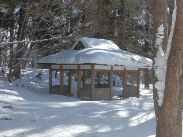 むつ市水源池公園は眼下に大湊・芦崎湾が広がり背後には名峰釜臥山が構える風光明媚な場所にあります。この地に明治時代から海軍施設が整備され、その後公園として開放され市民の憩いの場となっています。今回は、最も積雪が深い時季の公園を、雪や氷の世界を楽しみながらゆっくりと歩いてきました。