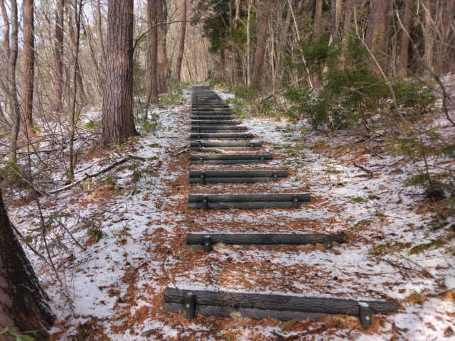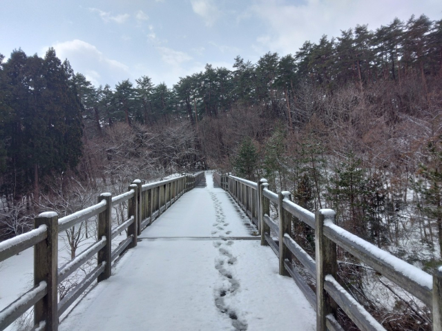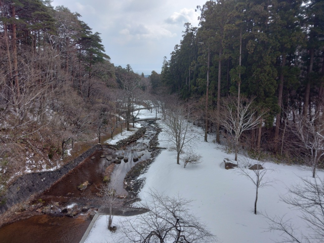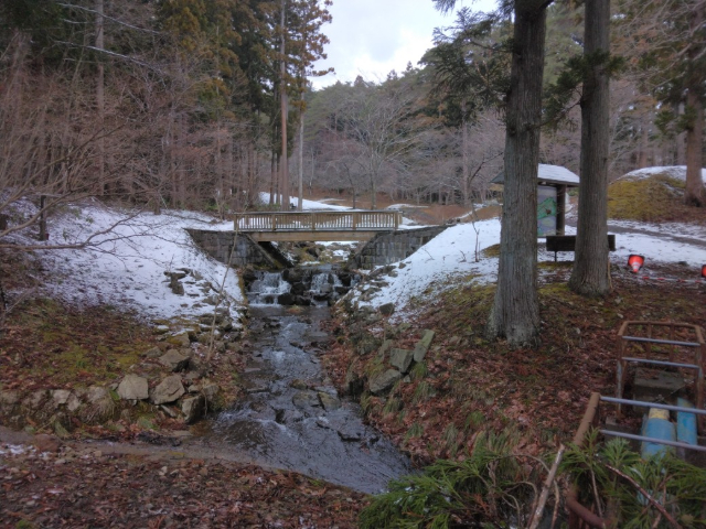 その後、「水と森の砂防ダムゾーン」に進みました。こちらは雪が残っており、一転冷たい空気が流れていました。足元の滑りやすい雪に気をつけながら歩きました。