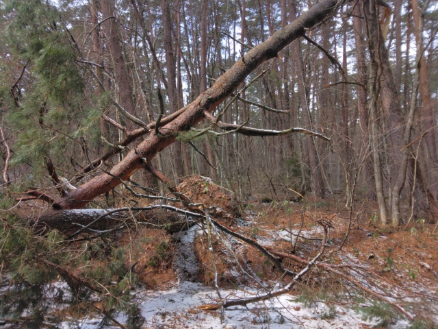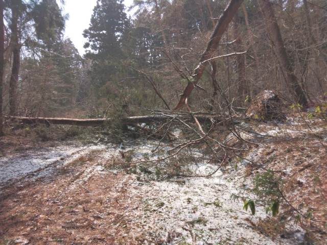 帰り道の森の中で大雪で倒れたマツの大木と遭遇、自然の大きな力を感じました。
